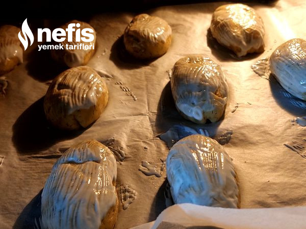 - Poğaça biçiminde kapatalım yağlı kağıt serdiğimiz fırın tepsisine yerleştirelim.