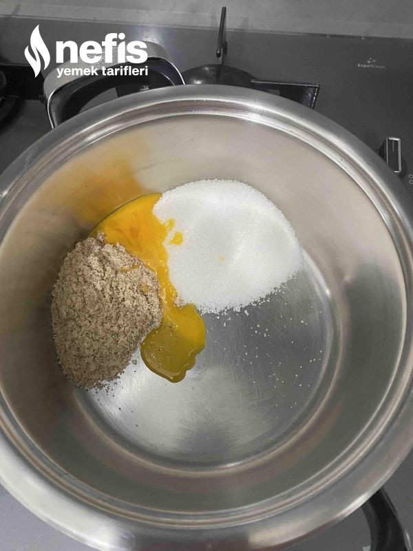 - Tencerenin içine 1 çay bardağı süt hariç süt, şeker, badem unu ve yumurta sarısını ek edip karıştırıyoruz.