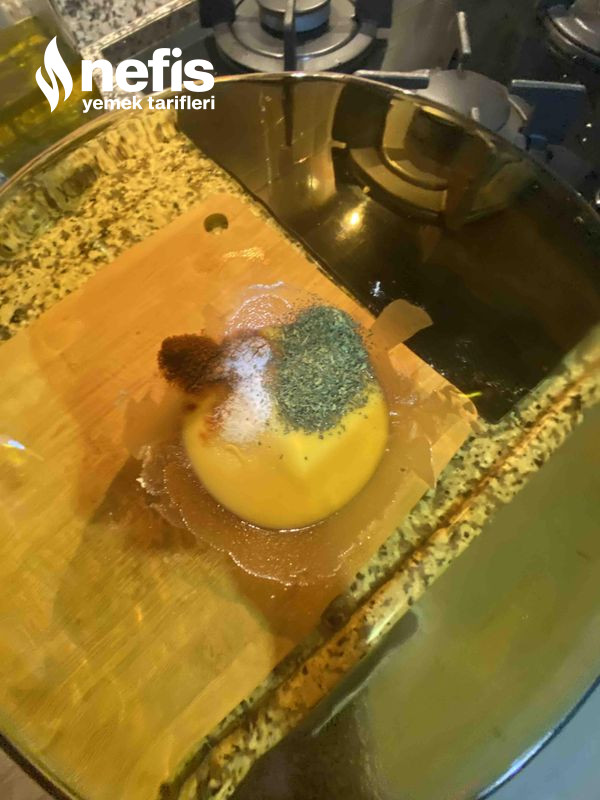 - Zeytin yağının içine mısır unu, tuz, kırmızı biber ve kuru naneyi ekleyip karıştırın (Bu evrede biraz çıtır olmasını isterseniz 1 çay kaşığı karbonat atabilirsiniz).