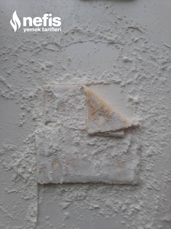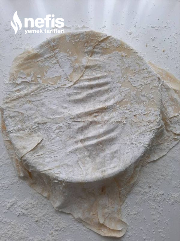 7. Üzerini bol nisasta ile kaplayalım. (nisastayı bol koymamızın nedeni kat kat ve kıyır kıyır bir baklava elde ediyoruz ) sonra gözleme yapar üzere açtığımız hamuru sağdan ve soldan kapayalım her kapadığımız katın üstüne de çokça nişasta yayalım.