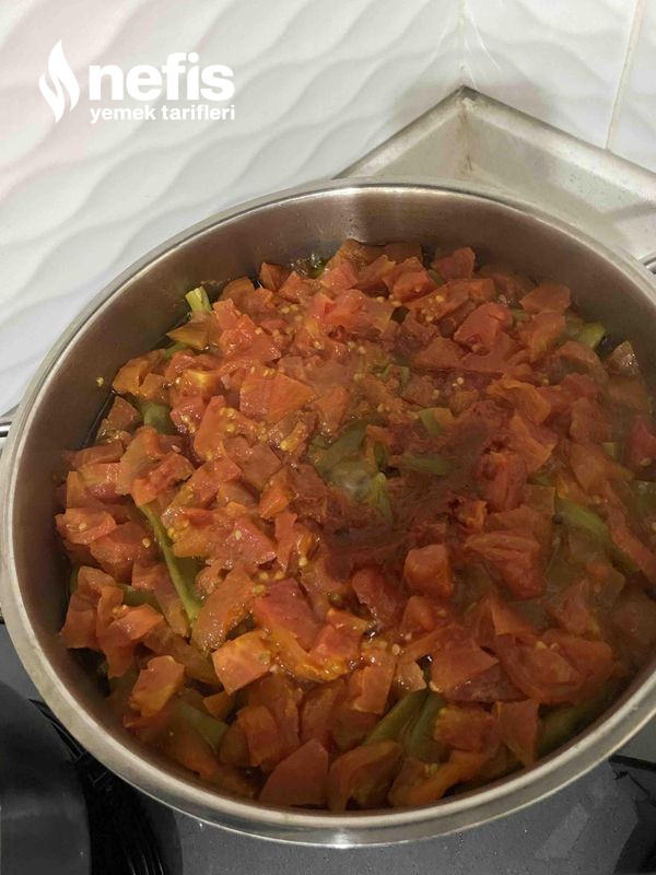 2. Domatesler yumuşayınca karıştıralım (ben 30-40 dk sonra karıştırıyorum fotoğraftaki üzere olunca) suyunu çekip güzelce yumuşayınca altını kapatalım. Ben hiç su eklemedim şayet pişmezse ekleyin.