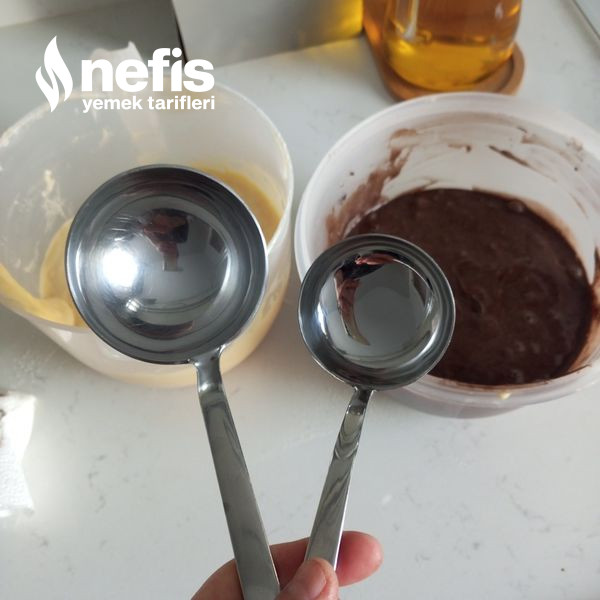 - Bu etapta kakaolu hamur için küçük kepçe sade hamuru için büyük kepçe kullanalım birebir büyüklükte kepçe kullanırsak kakaolu hamur baskın olduğu için sade hamuru kapatacaktır.