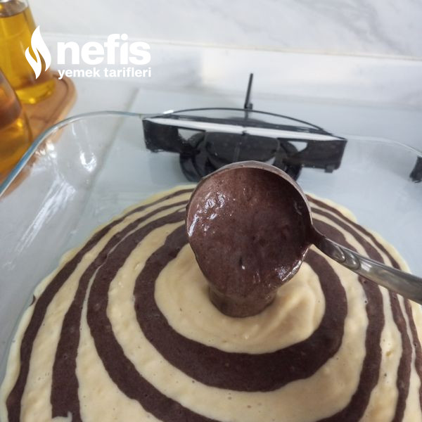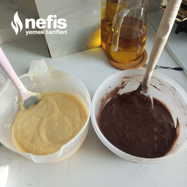 - Sıvı yağ ile yağladığımız tepsiye evvel sade kekten başlayarak bir kepçe sade bir kepçe kakaolu hamur olacak halde bitirinceye kadar dökelim.