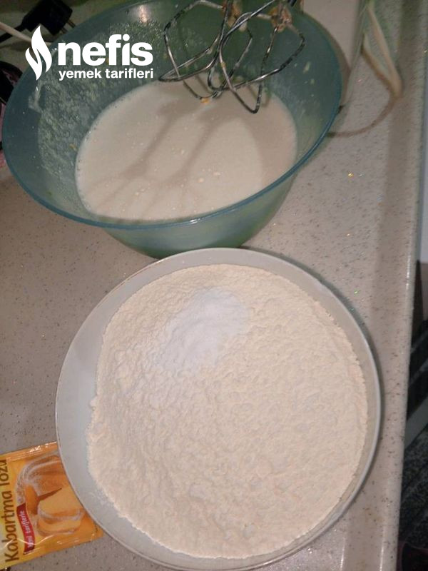 5. En son kabartma tozunu ekleyip, tekrar çırpalım ve hamuru bölmek için farklı bir kap alalım.