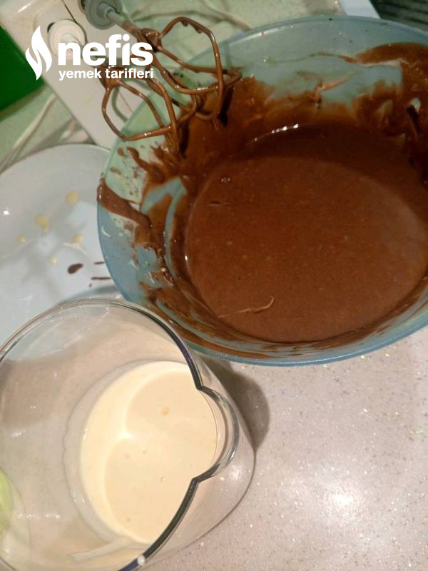 7. Diğer hamur için kakao ve yarım çay bardağı sütü ekleyip çırpalım.