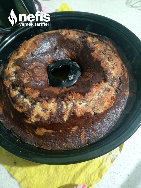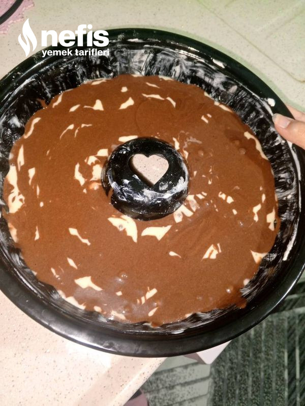 8. Daha sonra kalıbı dolaptan çıkarıp, bir sade hamur bir kakaolu hamur olacak biçimde dökelim.