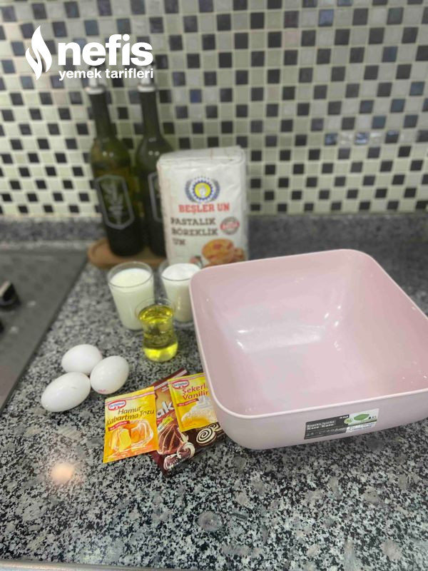 2. Daha sonra süt, sıvı yağ, kabartma tozu vanilyayı ,unu ekleyip karıştıralım.