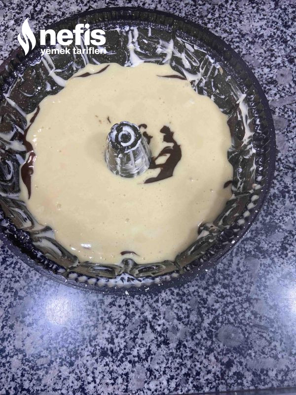 4. Kek kalıbımızın altını yağlayalım sonra birinci sade harcımızı sonra kakaolu harcımızı ekleyelim.