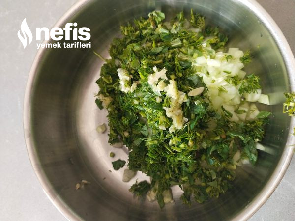 3. Yoğurt ve ezilen sarınsak üzerlerine eklenerek yeterlice karıştırılır.