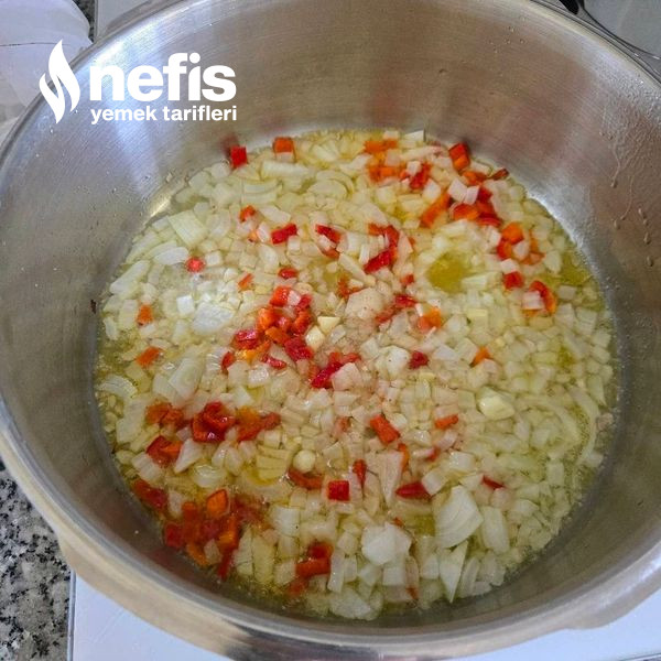 3. Düdüklü tencereye yağı koyup küçük küçük doğranmış soğan, kapya biber ve sarımsağı ekleyip kavurun.