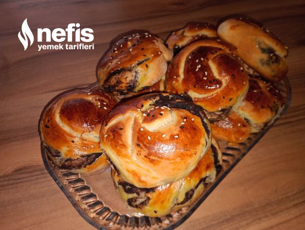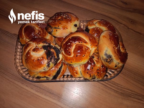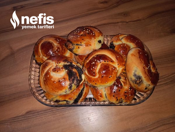 - Hamurdan bezeler al, aç, zeytin ezmesi sür yahut ayıklanmış zeytin den koy rulo yap, burup biçim ver. Tepsiye diz, 15-20 dk beklet isteğe bağlı olarak. Yumurta sarısı sür, istersen susam ve çörekotu serp.