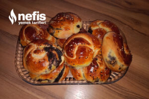 - Hamurdan bezeler al, aç, zeytin ezmesi sür yahut ayıklanmış zeytin den koy rulo yap, burup biçim ver. Tepsiye diz, 15-20 dk beklet isteğe bağlı olarak. Yumurta sarısı sür, istersen susam ve çörekotu serp.