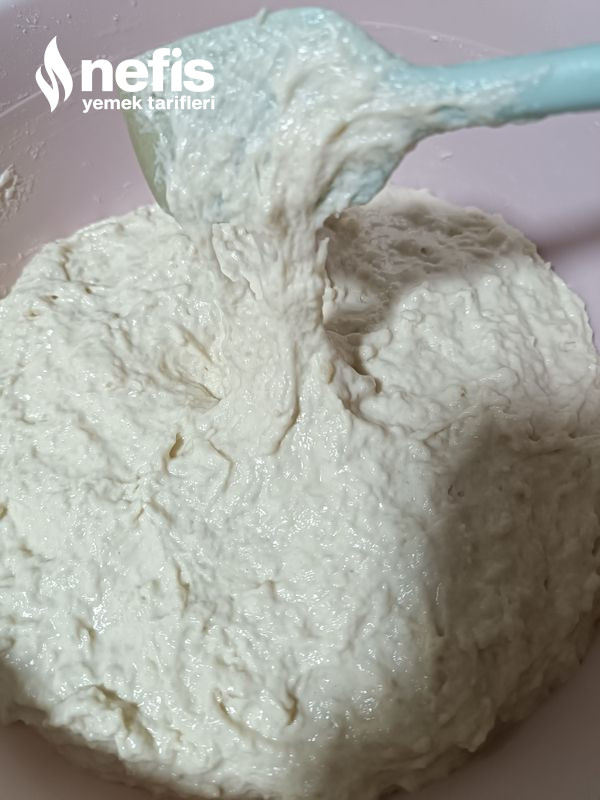 1. Ekmeğin ana materyallerini bir spatula yardımı ile düzgünce karıştırıyoruz. Kıvamı cıvık olacak fotoğraf ekledim orada görebilirsiniz. Un ölçüsü vermiyorum, herkes ununu bilir. Bu görünen kıvama ayarlayacaksınız işte. Pişi hamurundan bir tık daha cıvık olacak. Hamuru bu hale getirince yarım saat mayalanmaya bırakalım.