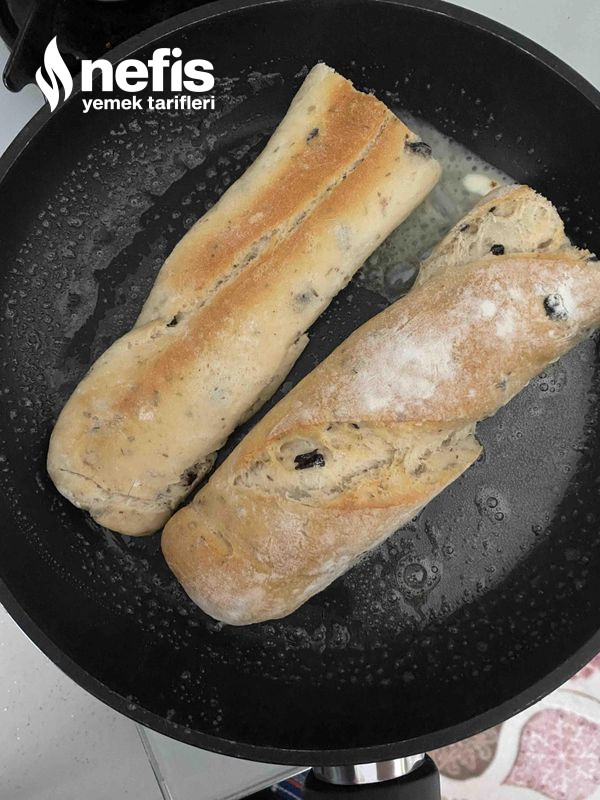- Daha sonra zeytinli baget ekmeklerimizi ortadan kesip iç kısımlarını tavaya basıp kızartalım.