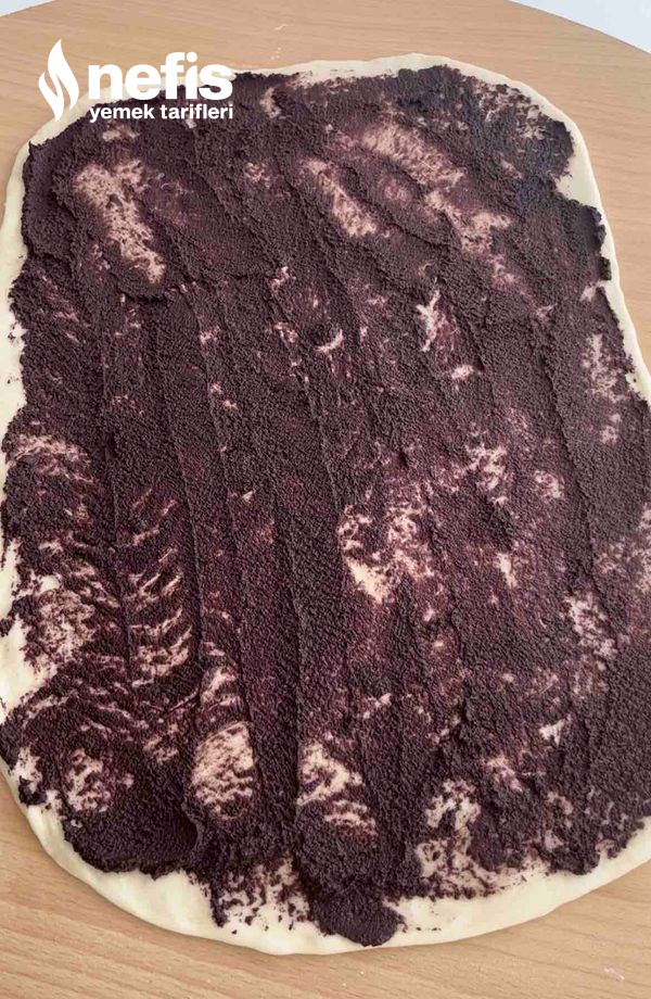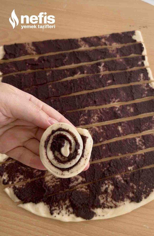 - Hamuru iki eşit kesime bölelim. Tahtayı ve üzerini yağlayıp dikdörtgen halinde açalım. İçine 2 yemek kaşığı zeytin ezmesini yayalım. İnce şeritler halinde dilimleyelim ve ucundan başlayıp saralım üzerine yavaşça bastırıp açık kalan kısmını yapıştıralım.