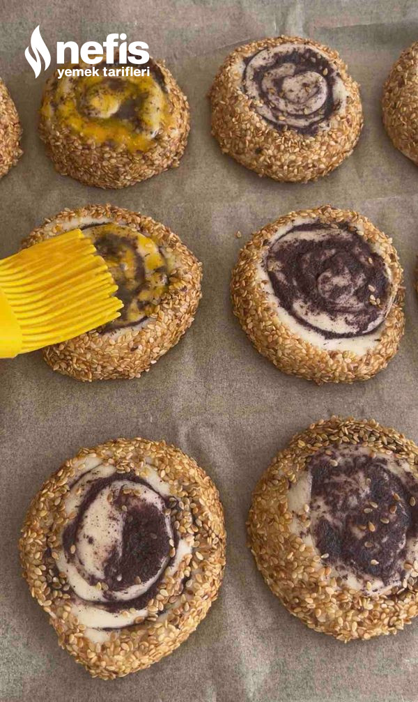 - Yumurta sarısını ve beyazını farklı ayrı çırpalım. Kenarlarını yumurta beyazına bulayıp susama batıralım. Hepsi bitince üzerlerine yumurta sarısı sürelim.