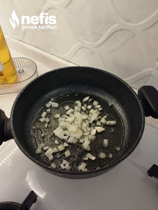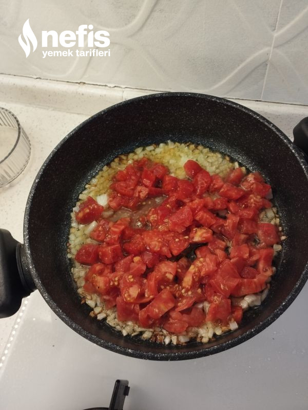 - Soğanı küp küp doğrayalım yağda kavuralım, salçayı ekleyelim karıştıralım, domatesi de ekleyip kavuralım.