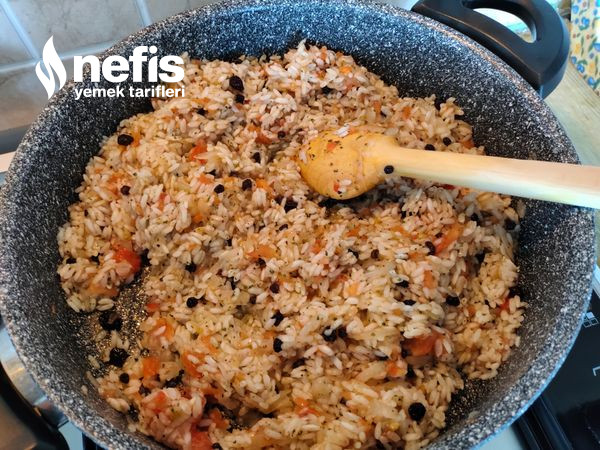 3. Suyunu çekince kabuğu soyulmuş ve rendelenmiş domatesi ekliyoruz, bu basamakta nane, karabiber ve kuş üzümünü ekliyoruz çok az.