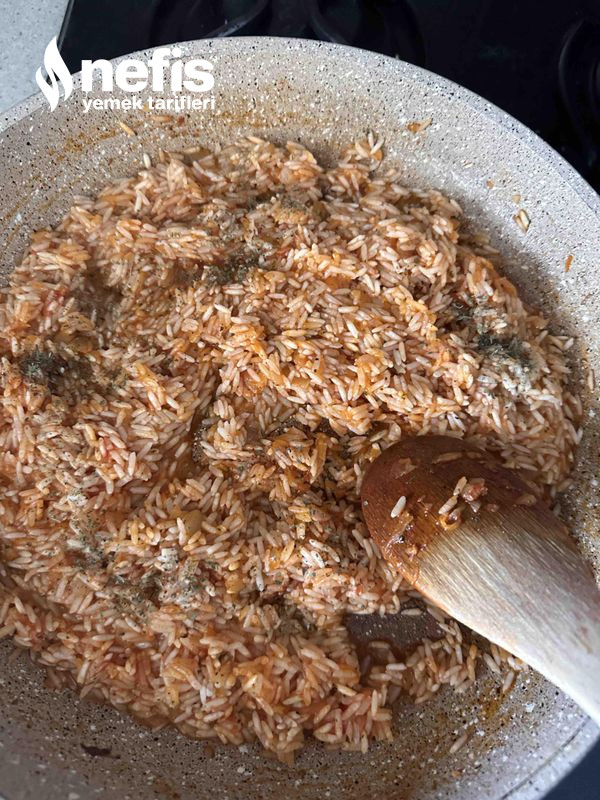 4. Yıkadığınız pirinçleri ve salçayı ekleyip karıştırın. En son baharatları ekleyip biraz daha pişirin. Tavayı ocaktan alın.