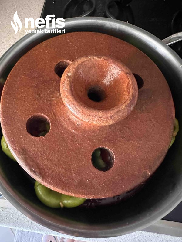 7. Tencereye dizdiğiniz biberlerin yarısından biraz fazla suyunu ekleyin ve üzerine dolma taşı yahut bir tabakla kapatıp 40 dk pişirin. Afiyet olsun 😋