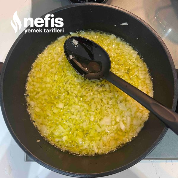 1. Bir adet soğanımızı küçük küçük doğrayıp, bol zeytinyağıyla birlikte kavurmaya bırakıyoruz.