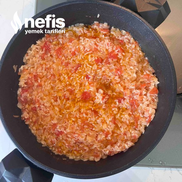 3. Domatesler soğanla birlikte piştikten sonra üzerine yıkadığımız pirinçlerimizi ekliyoruz.