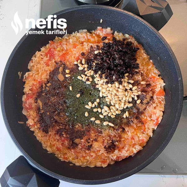 4. Pirinci bir taşım kavurduktan sonra üzerine tarçın, kuru nane, dolmalık fıstık ve 2-3 dakika sıcak suda beklettiğimiz kuş üzümlerini üzerine ekleyip karıştırıyoruz.