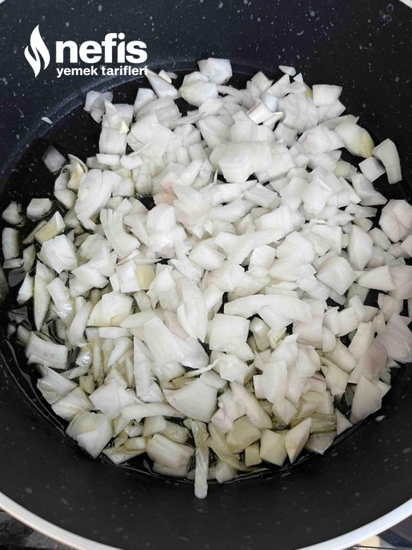 - Zeytinyağını tencereye koyuyoruz. Üzerine soğanımızı doğrayıp, kavuralım.