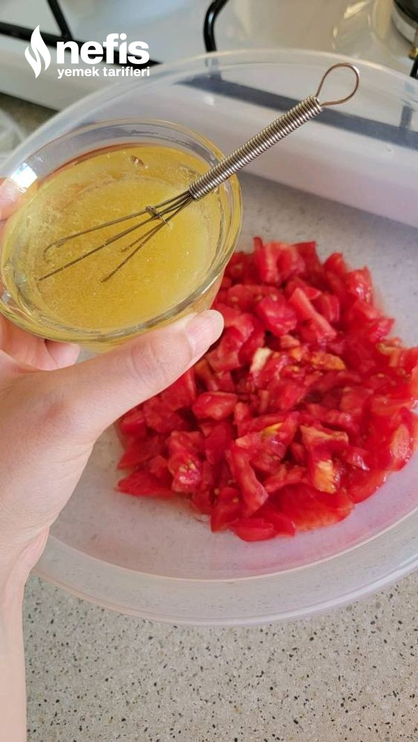 3. Ardından karıştırma kabına domates, dereotu doğranır, küçük bir kasede sosu hazırlanır,.