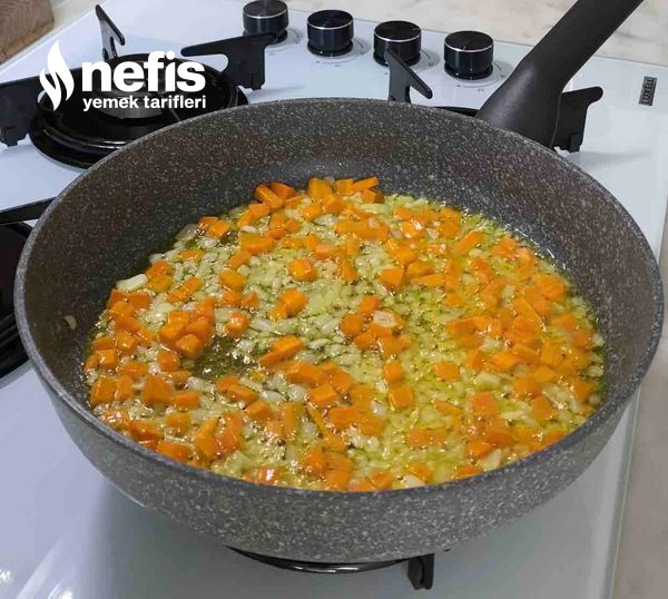 - Küçük küpler halinde doğradığımız havuçları da ekleyip soğanla birlikte kavurmaya devam edelim.