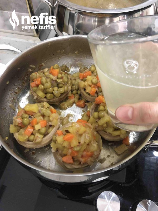 - Ayrı bir tencerede minik küpler halinde doğranmış kuru soğan zeytinyağında sotelenir.