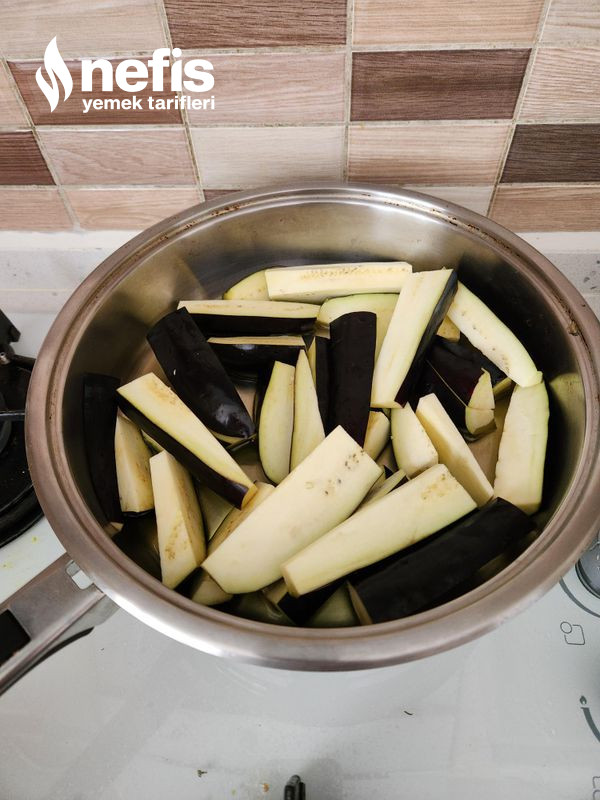 1. Patlıcan parmak uzunluğunda kesilir ve tuzlu suda biraz bekletilir.