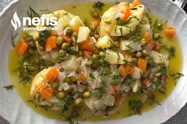 - Üzerine garnitürümüzü ek edelim 3 dakika daha karıştırarak kavuralım. Bir kaseye aldığımız zeytinyağı içine limon suyunu, un, tuz ve şekeri karıştırarak sos hazırlayalım.