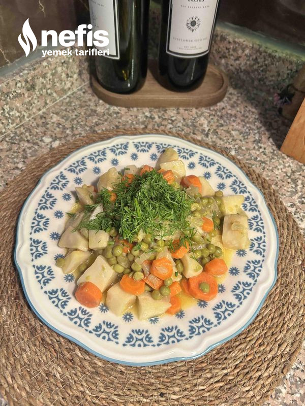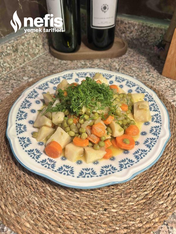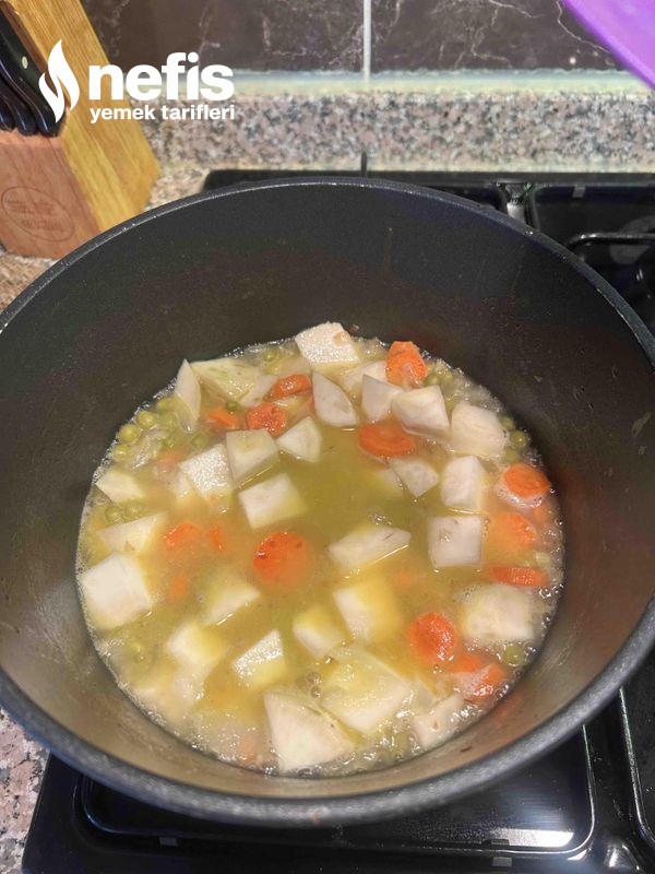 - Havuç kereviz ve bezelyeyi ekleyip karıştırıyoruz.