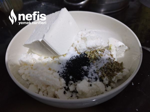 4. Peynir ,lor ,çörekotu ,kekik kabımıza alalım, karıştıralım.