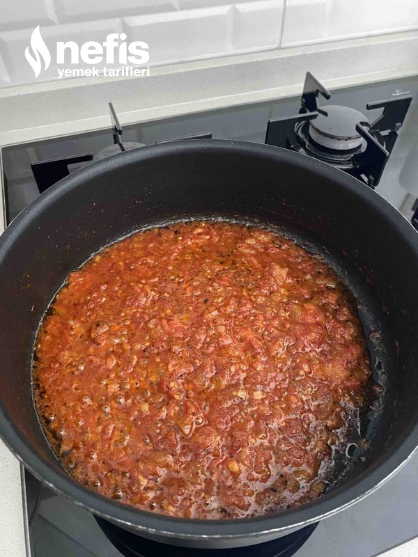 - Salçayı, baharatları ekleyip 2 dk karıştırıp rendelenmiş domatesleri ekliyoruz.