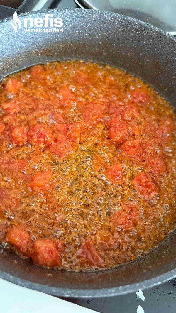 3. Domatesin kabuğu soyup küp küp doğrayın, tavaya ekleyip 5 dakika pişirin.