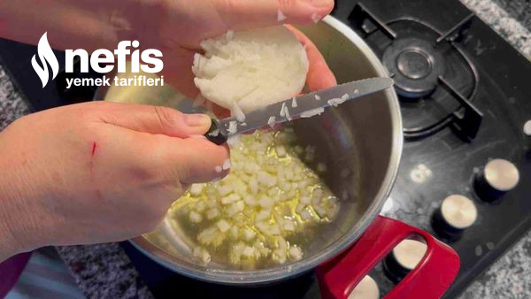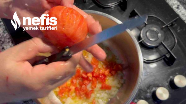 - Tencereye yağı alalım yağ kızdığında yemeklik doğradığımız kuru soğanı içerisine koyup kavuralım, kavrulan soğanın üzerine iki adet kabukları soyulmuş domatesmizi küp küp doğrayarak ek edelim.