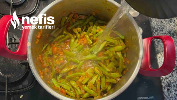- Fasulyeleri katıp karıştıralım fasulyenin rengi dönene kadar kavuralım üzerine iki su bardağı sıcak suyunu koyup yumuşayıncaya kadar pişirelim. Yaklaşık kısık ateşte 30 dakika.