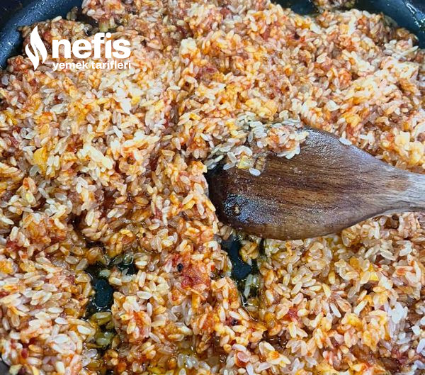 2. Salçaları atalım. Biraz kavurduktan sonra rendelenmiş domatesi ekleyelim. Yıkanmış pirinci de süzdükten sonra tencereye ek edelim. 3-4 dakika kavuralım.