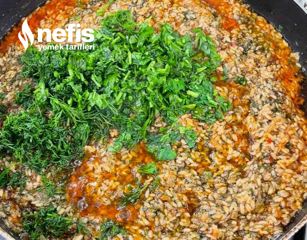 3. Baharatları, şekeri, kıyılmış maydanozu ve dereotunu ekleyip biraz soteledikten sonra 1 su bardağı sıcak su koyalım. Kısık ateşte pirinçler yumuşayana kadar pişirelim ve ılımaya bırakalım.