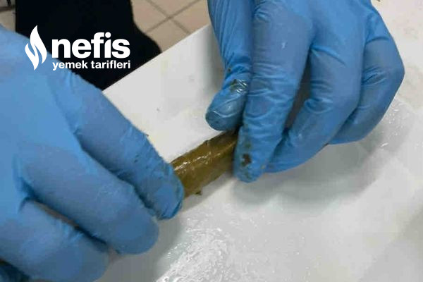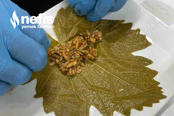 5. Yaprağın damarlı kısmı üste gelecek formda tezgaha serelim. Ortasına iç harçtan 1 tatlı kaşığı koyalım. Evvel yanlarını içe kıvırıp katlayalım. Rulo halini verelim.