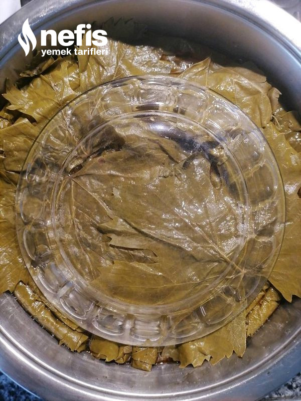 8. Tencerenin üzerine 4 adet asma yaprağı ile kapatalım üzerine tabak koyalım.