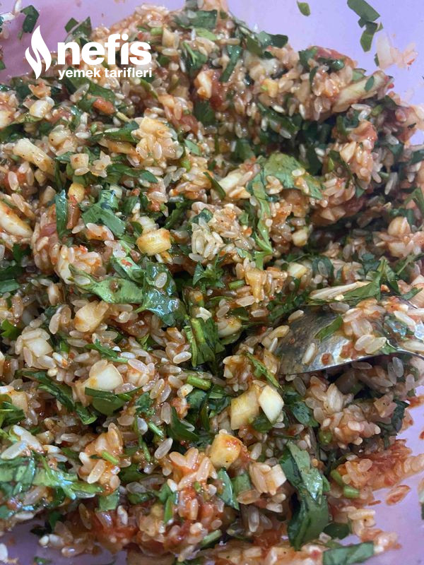 - İçimizi hazırlıyoruz soğan, domates, sarımsak, maydanoz derin bir kaba küçük küçük doğruyoruz pirinçlerimizi yıkayıp üzerine ekliyoruz salçalarımızı ve yağımızı ekliyoruz baharatlarımızı atıyoruz limonumuzu sıkıyoruz ve uygunca karıştırıyoruz.